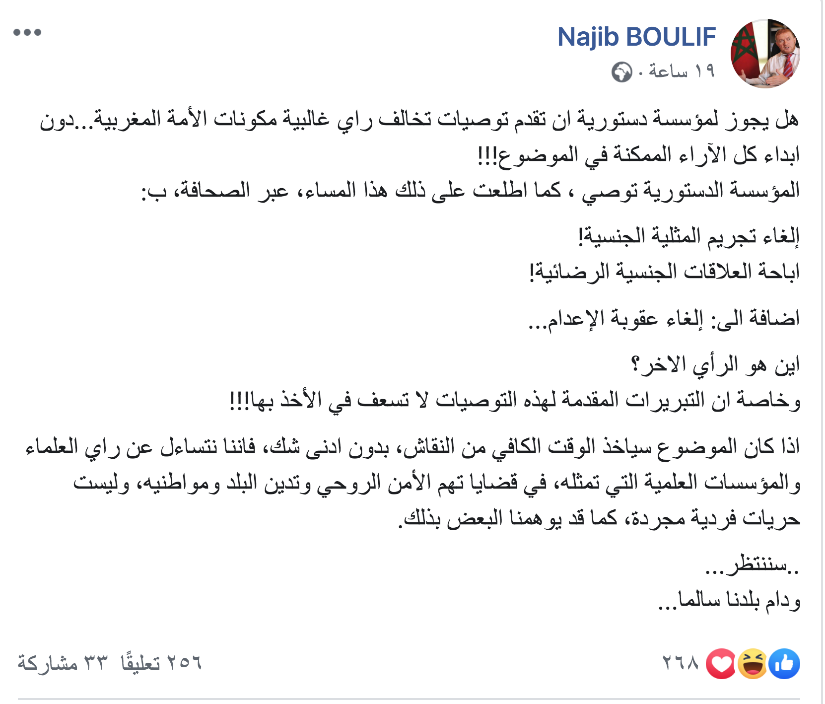 وقي تدوينة على حائطه الأزرق قال بوليف: “هل يجوز لمؤسسة دستورية أن تقدم توصيات تخالف رأي غالبية مكونات الأمة المغربية…دون إبداء كل الآراء الممكنة في الموضوع!!!