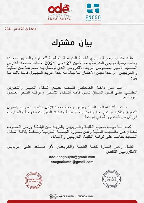 وفي هذا الصدد صدر بيان طلابي مشترك، حيث “عقد مكتب جمعية زيري لطلبة المدرسة الوطنية للتجارة والتسيير بوجدة ومكتب جمعية خريجي المدرسة يومة الاثنين 27 دجنبر 2021 اجتماعا مستعجلا لتدارس المستجد الأخير بخصوص البريد الإلكتروني الذي توصل به مجموعة من الطلبة والخريجين وأخذا بعين الاعتبار ما جاء به هذا البريد المجهول فإننا نؤكد ما يلي:
