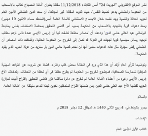 وقال البيان أن مانشره أحد المواقع الإلكترونية، من أن عضو الأمانة العامة للحزب، وعمدة فاس، إدريس الأزمي، طالب بتوجيه رسائل سياسية قوية لجهات في الدولة قد تصل حد الخروج من الحكومة الحالية غير صحيح، مضيفا أن موضوع الخروج من الحكومة لم يطرح مطلقا في أي لحظة من لحظات اجتماع الأمانة العامة الذي انعقد أول أمس.