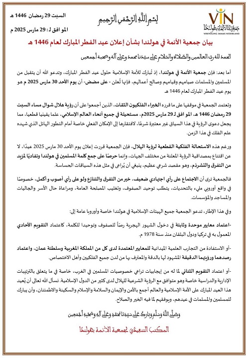 بيان مهم جدا لجمعية الأئمة في هولندا بشأن إعلان عيد الفطر 1446هـ
