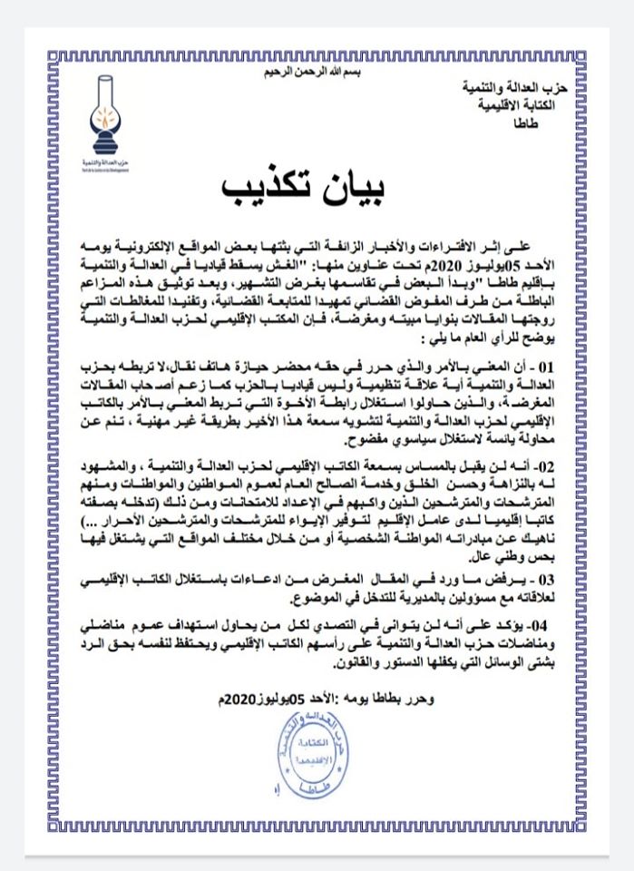 بعد تناول عدد من المنابر الإعلامية لخبر ضبط قيادي بالعدالة والتنمية بطاطا في حالة غش، خلال اجتيازه امتحانات الباكالوريا لهذه السنة، خرج حزب المصباح بالمدينة المذكورة ببيان تكذيب.