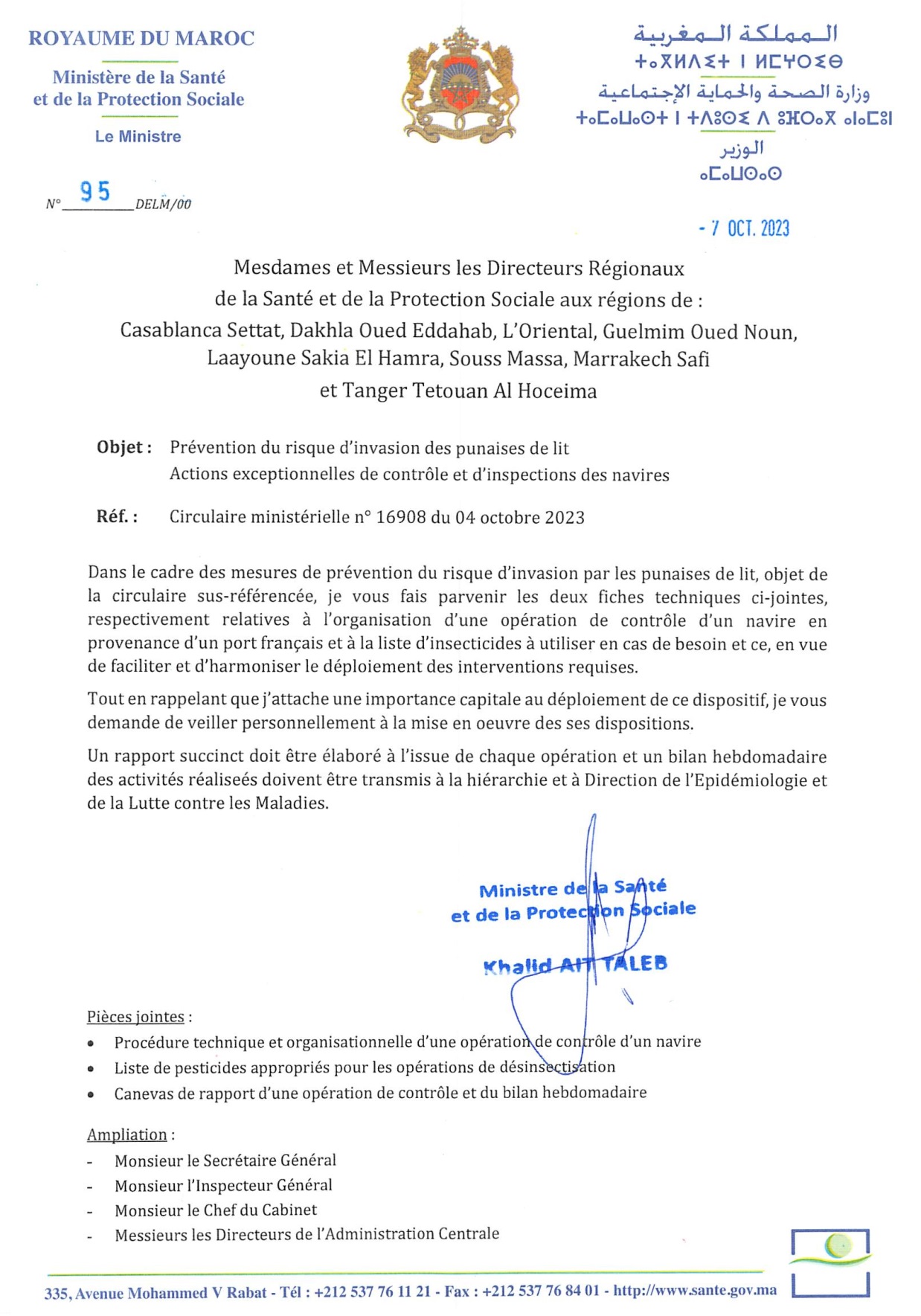 وجه الوزير خالد أيت الطالب، دورية إلى المدراء الجهويين لوزارة الصحة والحماية الاجتماعية بعدد من جهات المملكة، حول الإجراءات الاستباقية الضرورية لمواجهة خطر “غزو” بق الفراش الذي انتشر في فرنسا، في الآونة الأخيرة، خاصة ما يتعلق بمراقبة البواخر.