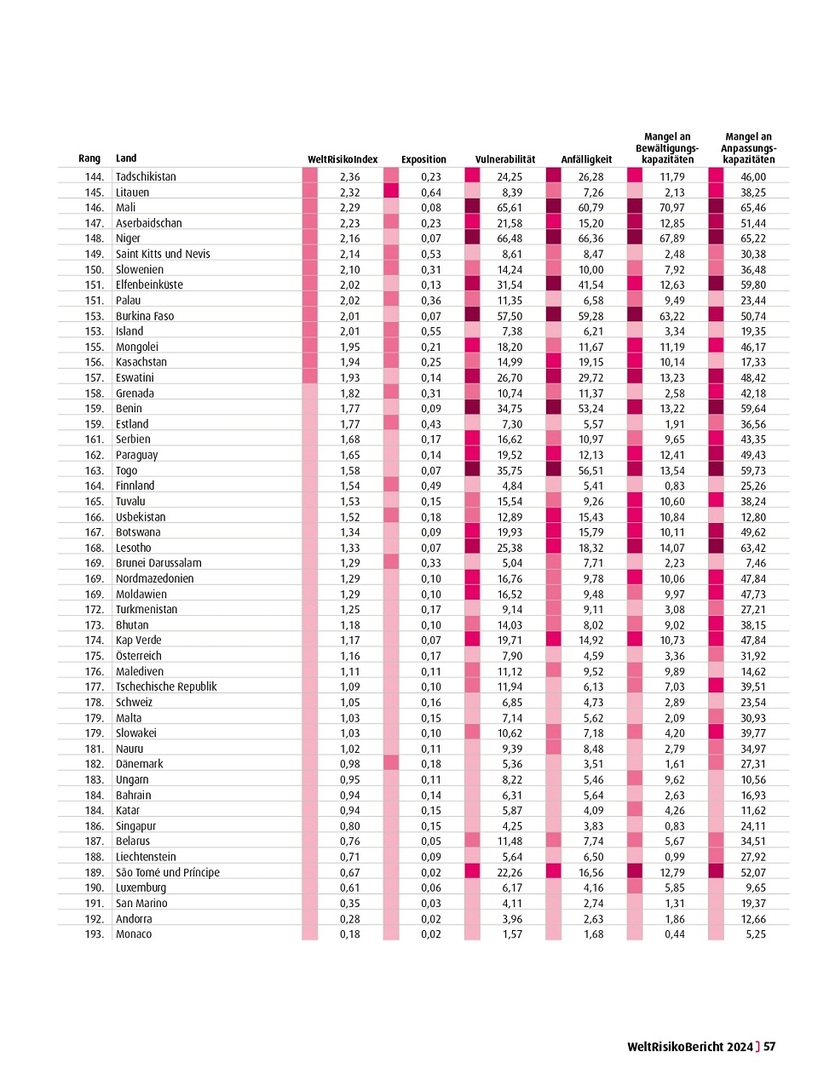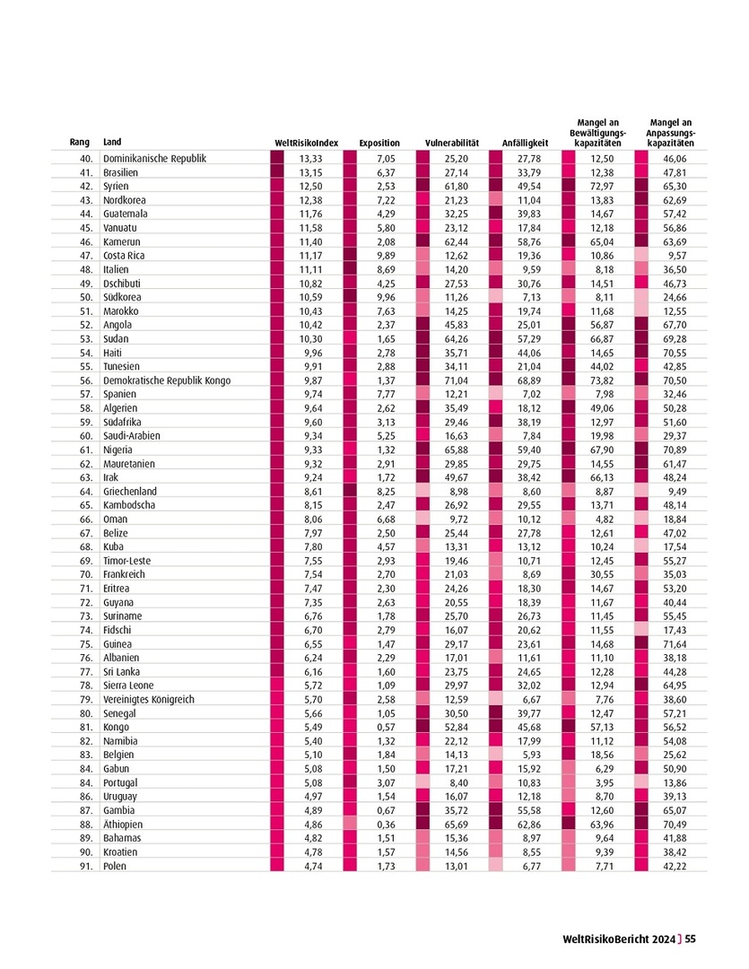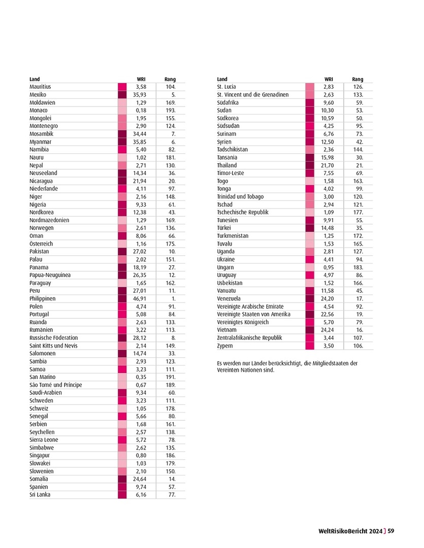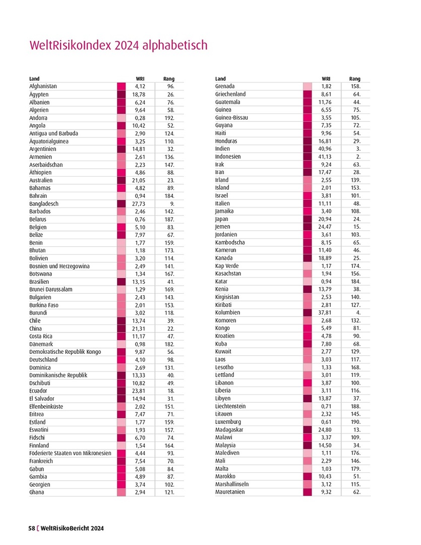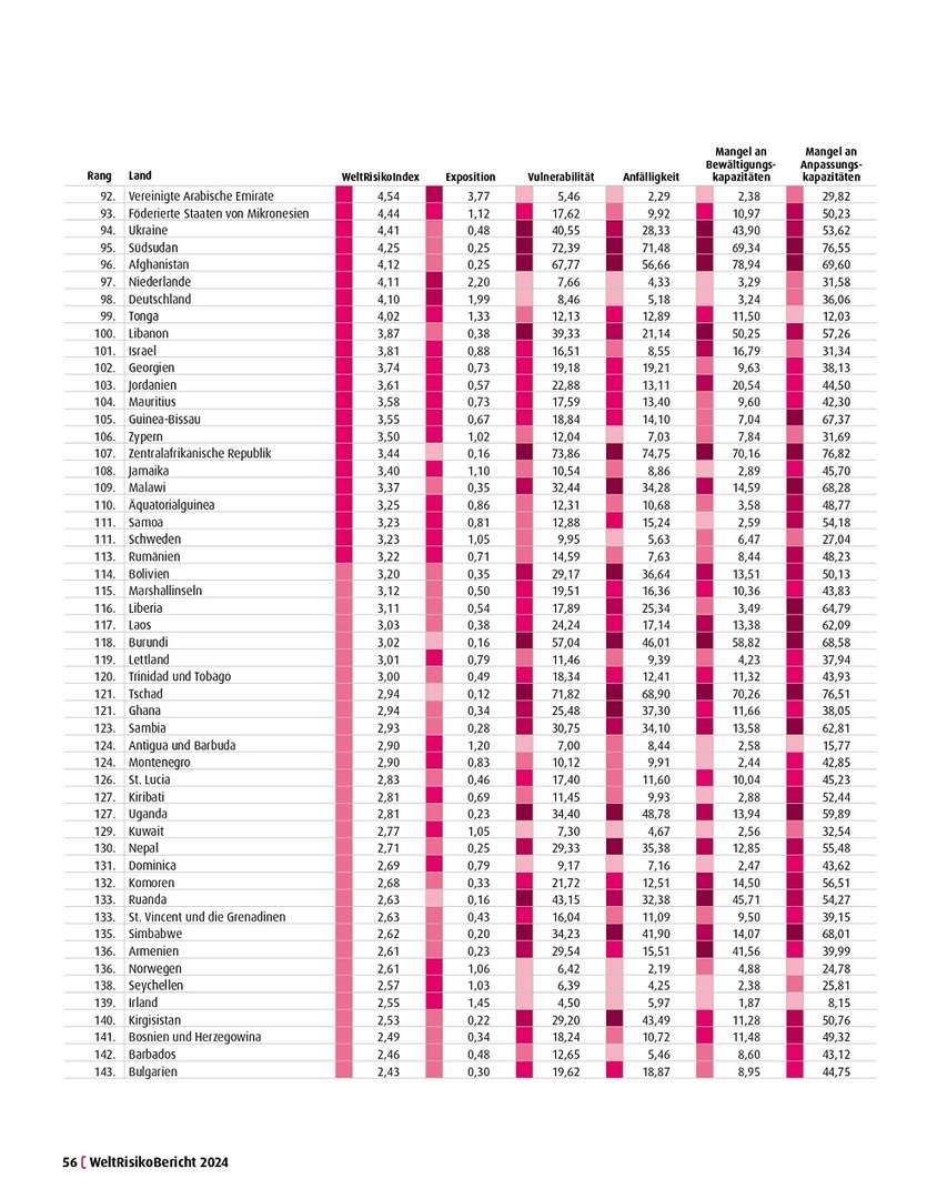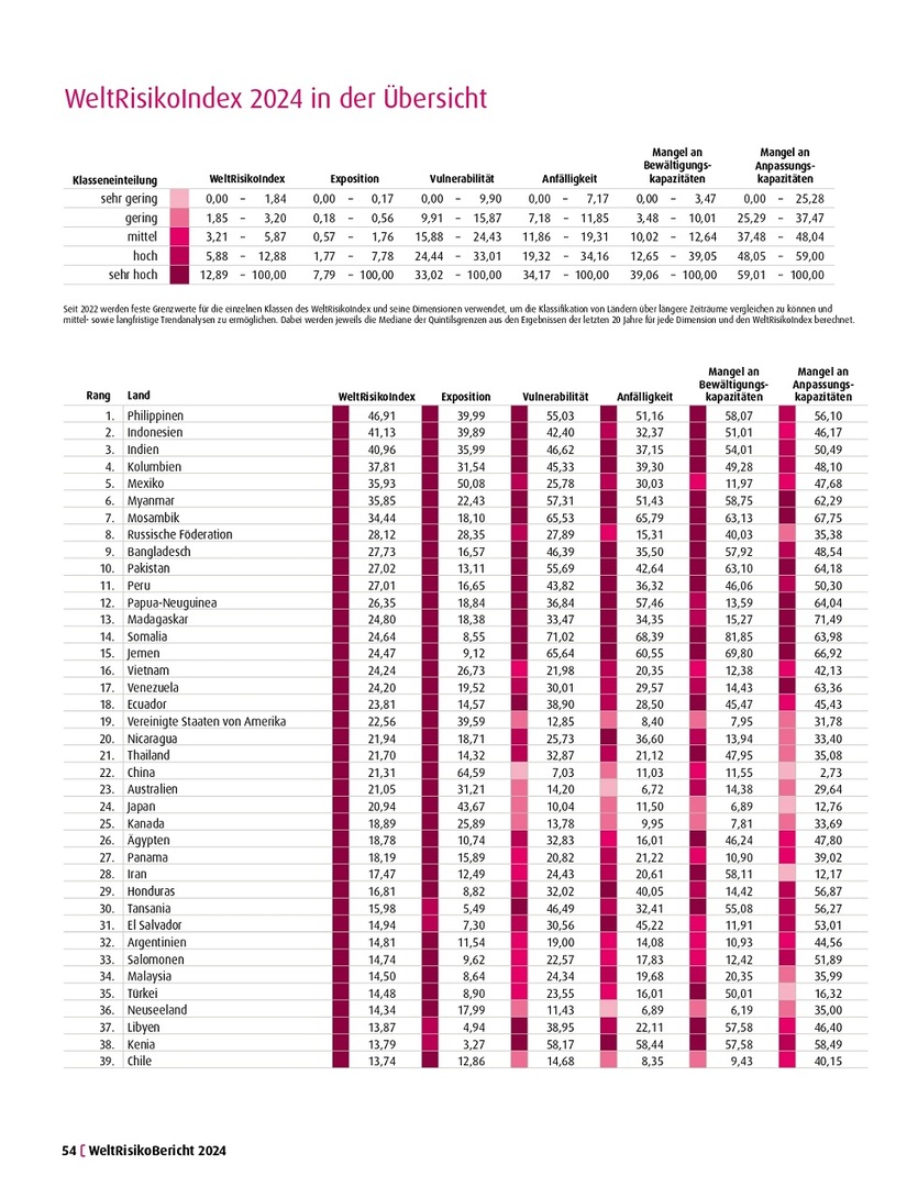 ويغطي التقرير 193 دولة عضوا في الأمم المتحدة جرى تصنيفها اعتمادا على مجموعات من المؤشرات الفرعية المرتبطة بتعرض الدولة للكوارث الطبيعية وقدرتها على الاستجابة والتعامل مع هذه الكوارث، ليقسمها إثر ذلك إلى خمس مجموعات من الدول ذات المخاطر المنخفضة جدا، التي تضم موناكو وأندروا ولوكسمبورغ وبيلاروس وفنلندا والبحرين وقطر، وصولا إلى البلدان ذات المخاطر العالية جدا، التي تصدرتها كل الفلبين وإندونيسيا والهند ودول أخرى.