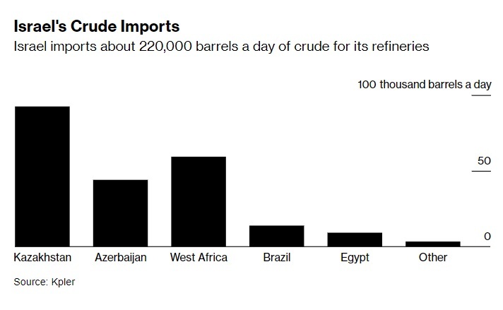 وسلط تقرير لوكالة “بلومبرغ” الضوء على واردات الكيان الغاصب من الذهب الأسود، وخاصة في ظل حربه الهمجية ضد قطاع غزة ودعوات للدول الإسلامية بقطع إمدادات الخام عن الكيان، التي لا تعتبر منتجة للنفط الخام.