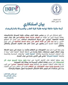 وقال مجلس طلبة الطب ومكتب طلبة الصيدلة بالدار البيضاء، في بلاغ مشترك، إن طلبة الكلية يعيشون أزمة مالية خانقة، مُعلنَيْن استعدادهما التام لخوض كافة الأشكال التصعيدية لصون حقوقهم.