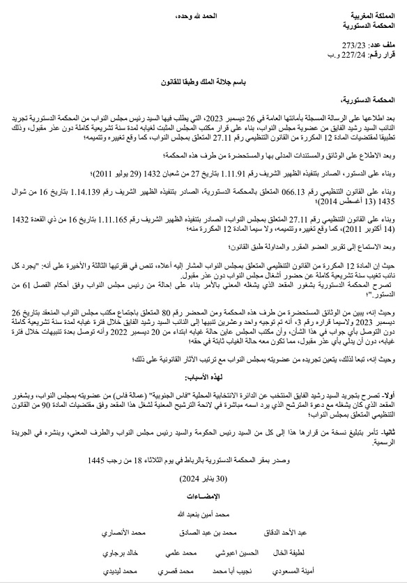 وأضافت المحكمة، أن القرار جاء بعد “اطلاعها على الرسالة المسجلة بأمانتها العامة في 26 ديسمبر 2023، التي يطلب فيها السيد رئيس مجلس النواب من المحكمة الدستورية تجريد النائب السيد رشيد الفايق من عضوية مجلس النواب، بناء على قرار مكتب المجلس المثبت لغيابه لمدة سنة تشريعية كاملة دون عذر مقبول، وذلك تطبيقا لمقتضيات المادة 12 المكررة من القانون التنظيمي رقم 27.11 المتعلق بمجلس النواب، كما وقع تغييره وتتميمه”.