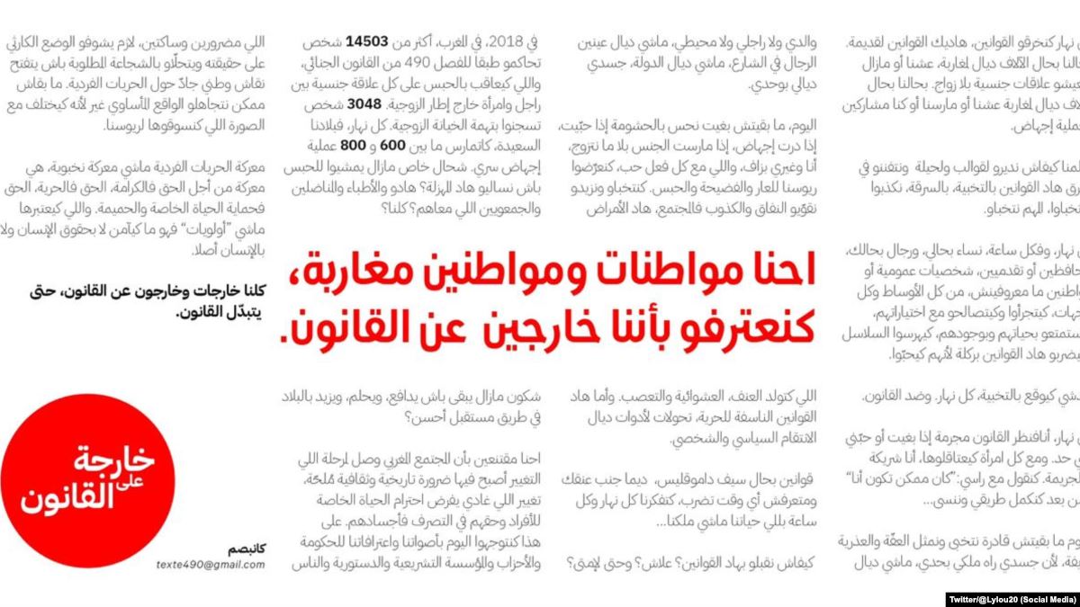 تحت عنوان “خارجات وخارجون عن القانون“، وقع عشرات من الرجال والنساء على عريضة للمطالبة بتغيير الفصل 490 من القانون الجنائي، وحسب ما أوردته صحيفة “لوموند” الفرنسية على صفحتها الأولى، فالموقعون يطالبون بالحق في الزنا واللواط والسحاق، و”احترام الحياة الخاصة للأفراد والحق في التصرف في أجسادهم”، ووجهوا مطالبهم للحكومة والأحزاب والمؤسسة التشريعية والدستورية والمجتمع المدني بالمغرب.