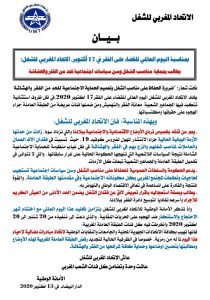 ودعا الإتحاد، الحكومة والسلطات العمومية للحفاظ على مناصب الشغل وسن سياسات إجتماعية تستجيب لحاجيات وتطلعات الشعب المغربية، في مقدمتها الطبقة العاملة. مطالبا الحكومة بصفة إستعجالية إقرار تعويض لائق عن فقدان الشغل، يضمن الحد الأدنى للعيش الكريم للأسر المغربية.