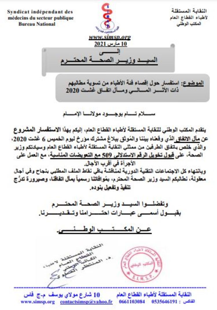 استفسر المكتب الوطني للنقابة المستقلة لأطباء القطاع العام، وزير الصحة خالد ايت الطالب، حول إقصاء فئة الأطباء من تسوية مطالبهم ذات الأثـــــر المــــالـــي ومـــآل اتفــاق غشــت 2020 الموقع بين الطرفين.