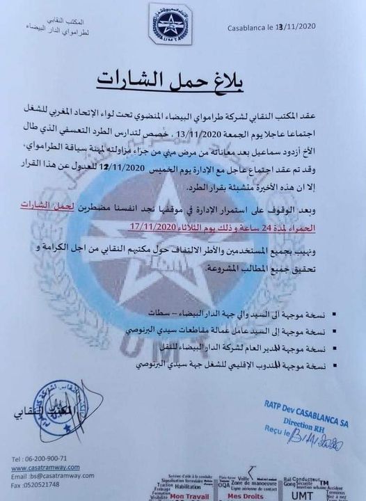قرر المكتب النقابي لشركة طرومواي-البيضاء، المنضوي تحت لواء الاتحاد المغربي للشغل، حمل الشارات الحمراء لمدة 24 ساعة، يوم الثلاثاء القادم، تضامنا مع عامل زميل لهم، طرد “تعسفيا” من الشركة.