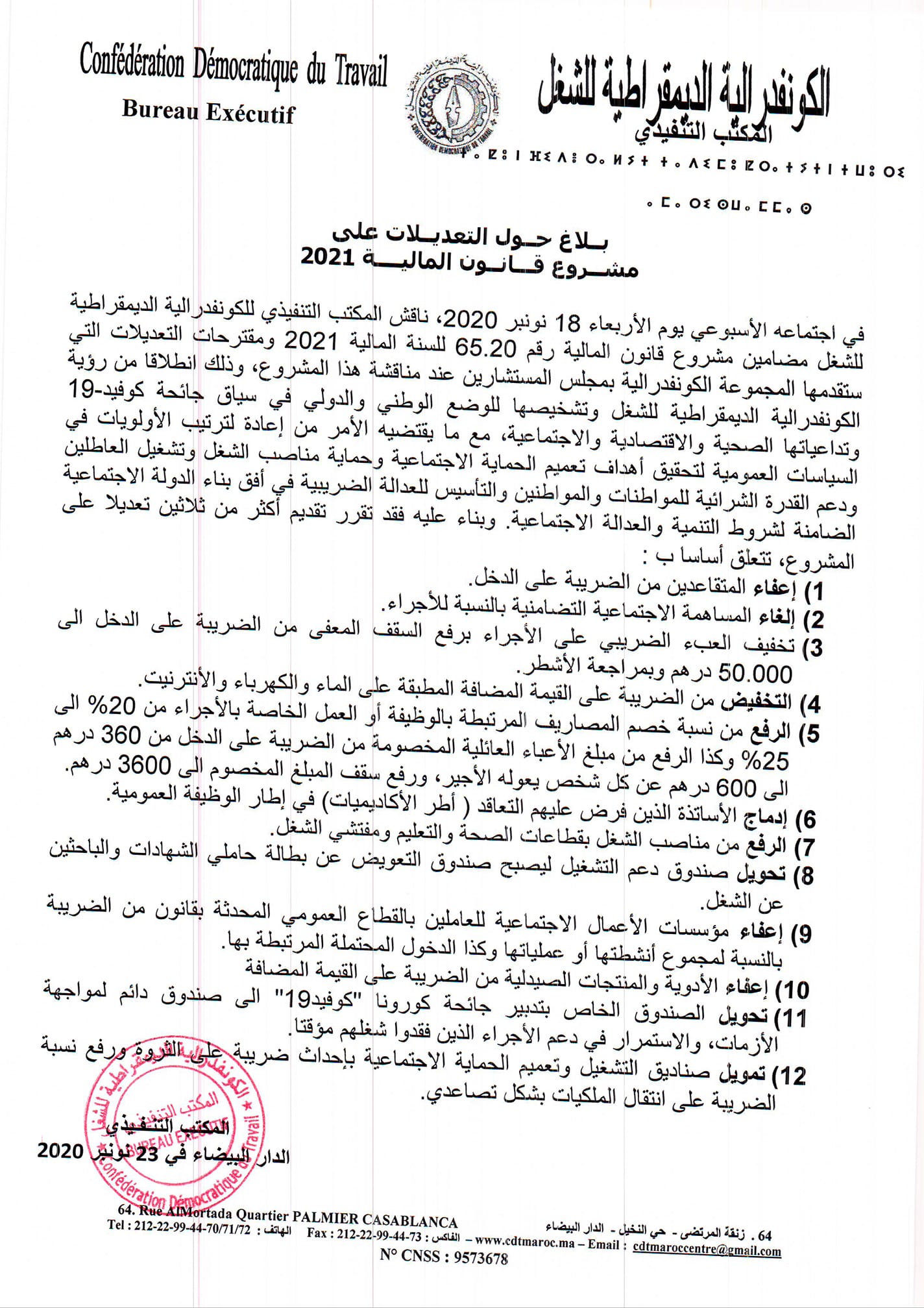 طالبت الكونفدرالية الديمقراطية للشغل بإعادة ترتيب الأولويات في السياسات العمومية، لتحقيق أهداف تحقيق الحماية الاجتماعية، وحماية مناصب الشغل وتشغيل العاطلين، ودعم القدرة الشرائية للمواطنين، والتأسيس للعدالة الضريبية. مقترحة إعفاء المتقاعدين من الضريبة على الدخل، وإلغاء المساهمة الاجتماعية التضامنية بالنسبة للأجراء، مع تخفيف العبء الضريبي عليهم، برفع السقف المعفى من الضريبة على الدخل إلى 50 ألف درهم، وبمراجعة الأشطر.