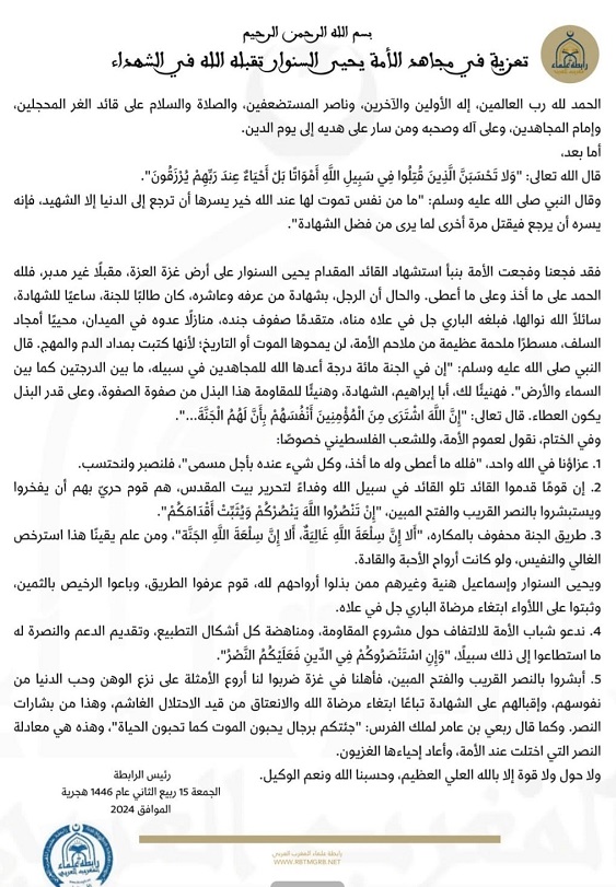تعزية رابطة علماء المغرب العربي في استشهاد القائد يحيى السنوار (بيان)