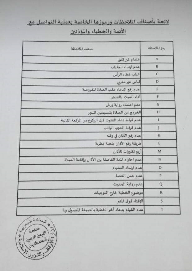 وشملت الوثيقة لائحة بأصناف الملاحظات ورموزها الخاصة بعملية التواصل مع الأئمة والخطباء والمؤذنين مصنفة بحروف لاتينية من A إلى T وفق الوثيقة أسفله.