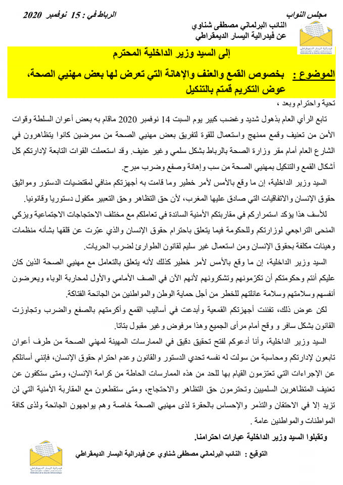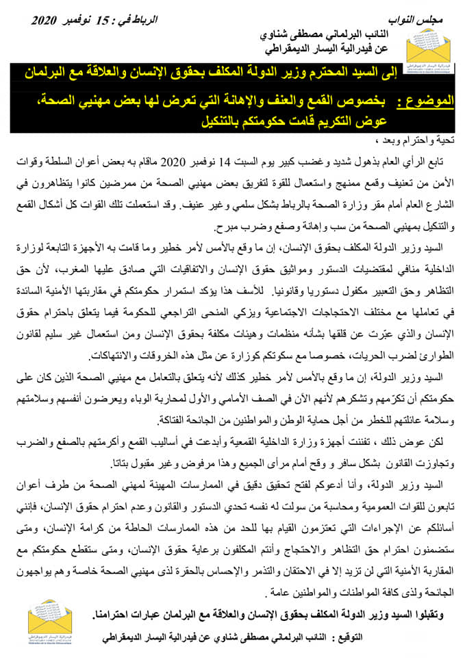 وجه مصطفى الشناوي، النائب البرلماني عن فيدرالية اليسار سؤالين لوزير الداخلية عبد الوافي لفتيت ووزير الدولة المكلف بحقوق الإنسان مصطفى الرميد، بخصوص القمع والعنف الذي تعرض له الممرضون وتقنيو الصحة أول أمس السبت من قبل القوات العمومية بالقرب من وزارة الصحة بالرباط.