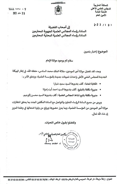 وختمت الرسالة التي وقعها الأمين العام للمجلس العلمي الأعلى، د. محمد بسف، بأنه “يرجى من جميع السادة الرؤساء التعاون والتواصل مع السادة المكلفين الجدد بما يحقق انتظارات مولانا أمير المومنين من المؤسسة العلمية، وبما يعزز حضورها ويرفع من وتيرة اشتغالها في وطننا العزيز إن شاء الله تعالى”. اهـ