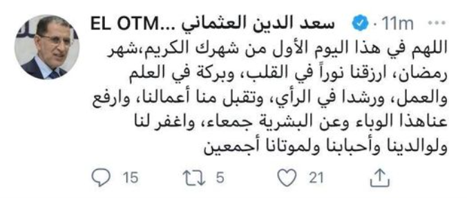 حيث غرد رئيس رئيس الحكومة على حسابه بتويتر “اللهم في هذا اليوم الأول من شهرك الكريم شهر رمضان، ارزقنا نورا في القلب، وبركة في العلم والعمل، ورشدا في الرأي، وتقبل منا أعمالنا، وارفع عنا هذا الوباء وعن البشرية جمعاء، واغفر لنا ولوالدينا وأحبابنا ولموتانا أجمعين”.