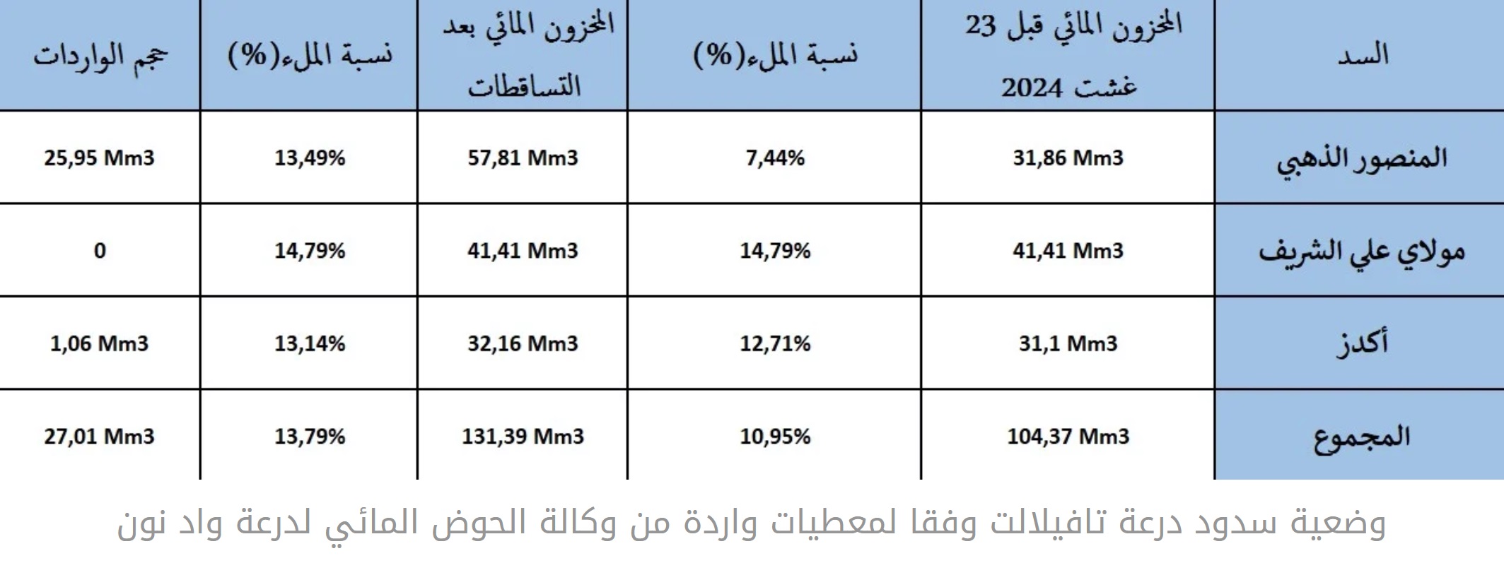 وذكر المصدر أن هذه التساقطات المطرية أنعشت أيضًا سد أكدز، حيث زادت حقينته بمقدار 1.06 مليون متر مكعب، لترتفع نسبة ملئه من 31.1 مليون متر مكعب إلى 32.16 مليون متر مكعب.