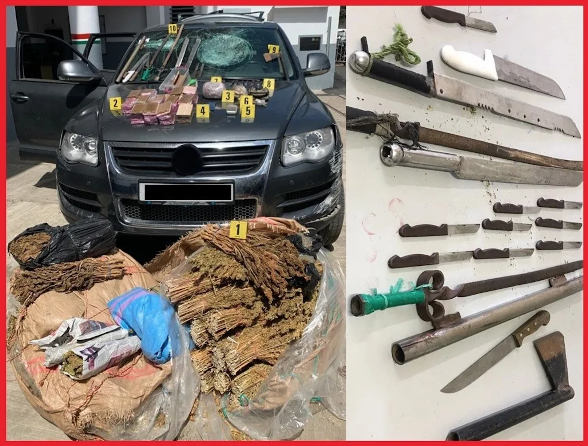و8 كيلوغرامات و 200 غراما من مخدر الشيرا، وكمية من التبغ المهرب، فضلا عن 13 سلاحا أبيض، بينها أربعة سيوف.