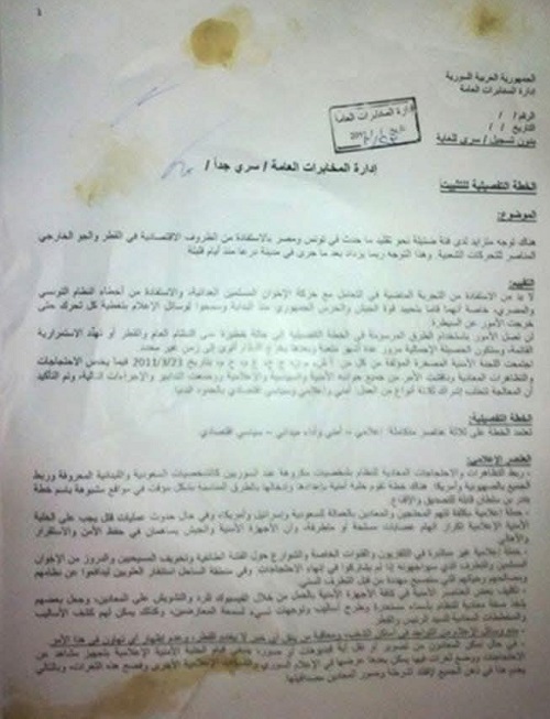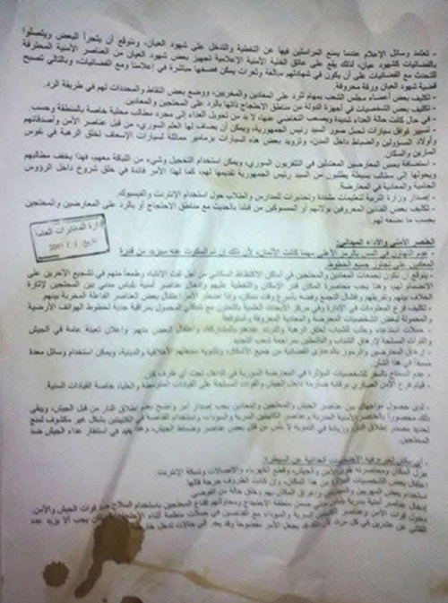 اجتمعت اللجنة الأمنية المصغرة المؤلفة من كل من أ.ش م.ن ، ج.ح ، ع.م ، ح.م بتاريخ 23/3/2011 فيما يخص الاحتجاجات والتظاهرات المعادية وناقشت الأمر من جميع جوانبه الأمنية والسياسية والإعلامية ووضعت التدابير والإجراءات التالية وتم التأكيد أن المعالجة تتطلب إشراك ثلاث أنواع من العمل: أمني وإعلامي وسياسي اقتصادي بالحدود الدنيا.
