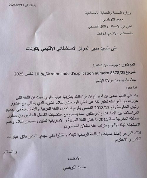 رفض تقني في الإسعاف والنقل الصحي بالمستشفى الإقليمي بتاونات الإجابة عن مراسلة بالفرنسية من مدير المستشفى، حسب ما في جوابه (الوثيقة).