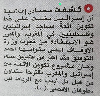 وحسب ما جاء في قصاصة الجريدة في عددها لهذا الأسبوع في نافذة “ما خفي”، فقد “كان مشروع تكوين الأئمة بين “إسرائيل” والمغرب مقترحا للتعاون من قبل تل أبيب مع الرباط قبل “طوفان الأقصى””.