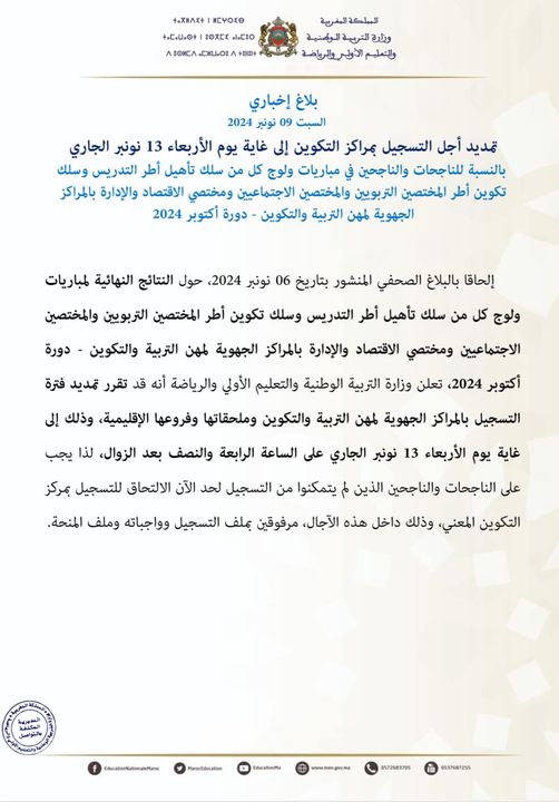 تمديد أجل التسجيل بمراكز التكوين بالنسبة للناجحات والناجحين في مباريات ولوج كل من سلك تأهيل أطر التدريس وسلك تكوين أطر المختصين التربويين والمختصين الاجتماعيين ومختصي الاقتصاد والإدارة بالمراكز الجهوية لمهن التربية والتكوين – دورة أكتوبر 2024.
