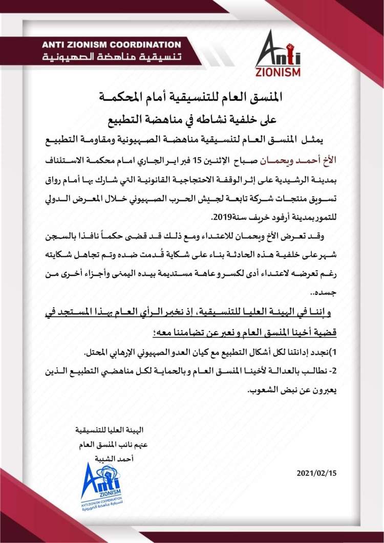 أعلنت التنسيقية الدولية لمناهضة الصهيونية، تضامنها مع الناشط الحقوقي والمناهض للتطبيع مع الكيان الاسرائيلي، أحمد ويحمان، في قضيته المعروضة امام محككة الاستئناف بالرابشيدية، بعد تنديده بحضور شركة نطافيم الاسرائيلية بالمعرض الدولي للتمور بأرفود سنة 2019.