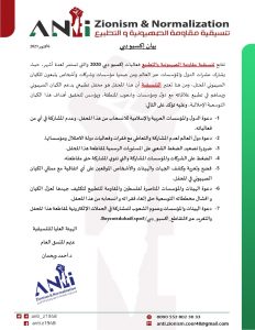وأكدت “ضرورة تصعيد الضغط الشعبي على المستويات الرسمية لمقاطعة هذا المحفل”، وكذا “الضغط على الشركات والمؤسسات المشاركة والتي تنوي المشاركة حتى مقاطعته”، مع “فضح وتعرية وكشف الجهات والهيئات والأشخاص الموقعين على أي اتفاقية مع ممثلي الكيان الصهيوني في المحفل”.