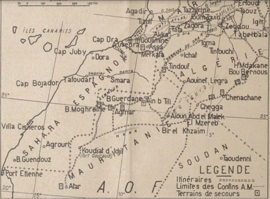لم يكن هذا الجزء من الصحراء مجهولا تماما بالنسبة لنا، إذ سبق أن قامت قوات مشاة مهاريس تابعة لكتائبنا الصحراوية في الجزاير، أو مجموعات الرحل (مجندون من قبل فرنسا) من موريتانيا، بعمليات استطلاع أو ملاحقة المغيرين من هناك، لكن إذا مكنتنا جميع هذه البعثات الإستطلاعية من معلومات قيِّمة، فسنثبت لاحقا قواعد لعمليات صحراوية في هذه الناحية.