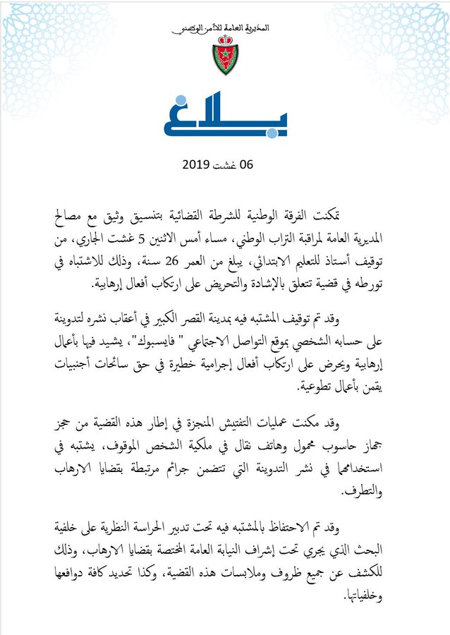 أوقفت الفرقة الوطنية للشرطة القضائية بتنسيق مع المديرية العامة لمراقبة التراب الوطني، مساء الاثنين، أستاذا للتعليم الابتدائي (26سنة) بمدينة القصر الكبير، بعد نشره لتدوينة يشيد فيها بأعمال إرهابية ويحرض على ارتكاب جرائم خطيرة في حق سائحات أجنبيات.