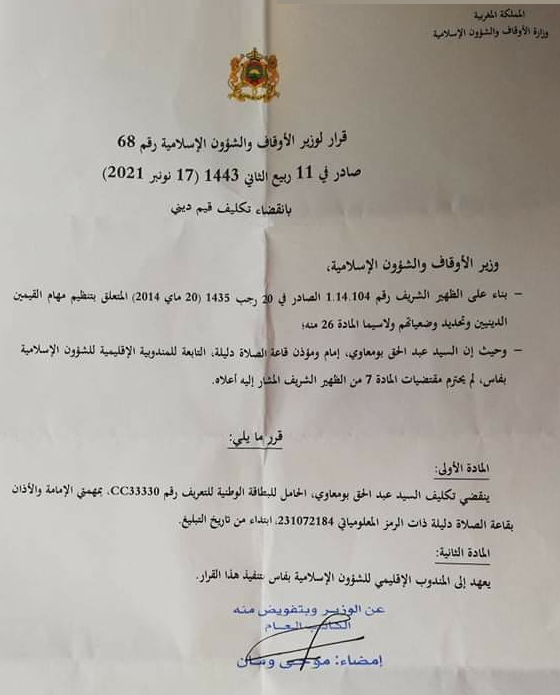 أصدر وزير الأوقاف قرارا (رقم 65 الصادر في 17 نونبر 2021) يقضي بإنهاء تكليف القيم الديني، الإمام والمؤذن عبد الحق بومعاوي، الذي كان يؤذن ويؤم المصلين بقاعة الصلاة دليلة التابعة للمندوبية الإقليمية للشؤون الإسلامية بمدينة فاس.