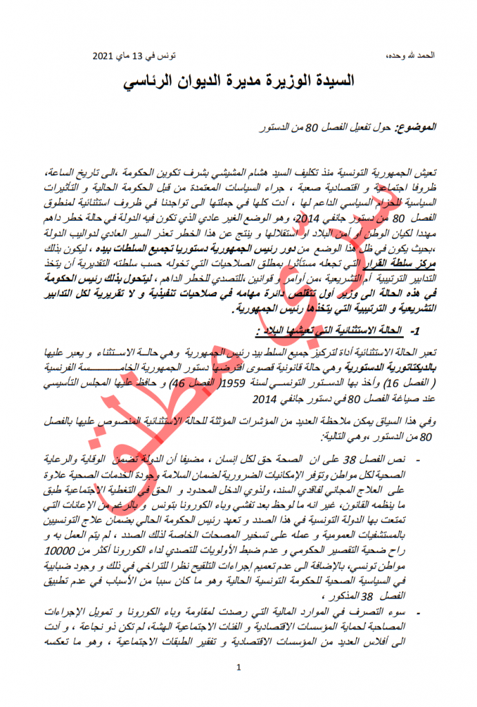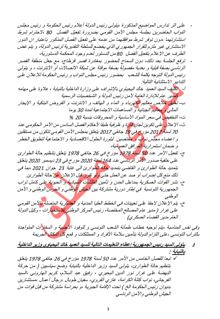 بعد ذلك، سيعلن الرئيس سعيد للحاضرين، الذين من بينهم رئيس الوزراء هشام المشيشي ورئيس البرلمان زعيم حزب النهضة راشد الغنوشي، أنه سيفعّل الفصل 80 من الدستور الذي يسمح للرئيس بالاستيلاء على السلطات في حالة طوارئ وطنية.