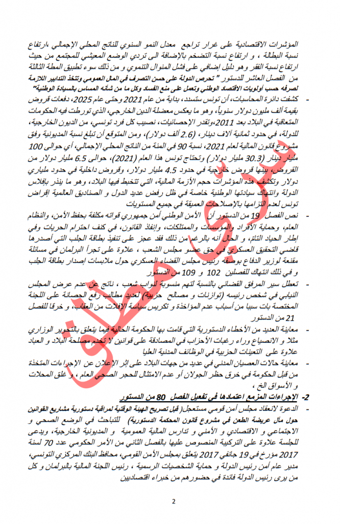 تتضمن الخطة مقترحات لمنع أي برلماني مطلوب للمحاكم التونسية من مغادرة البلاد، وإعفاء جميع المنتمين إلى الأحزاب السياسية من مناصبهم في البلاد.