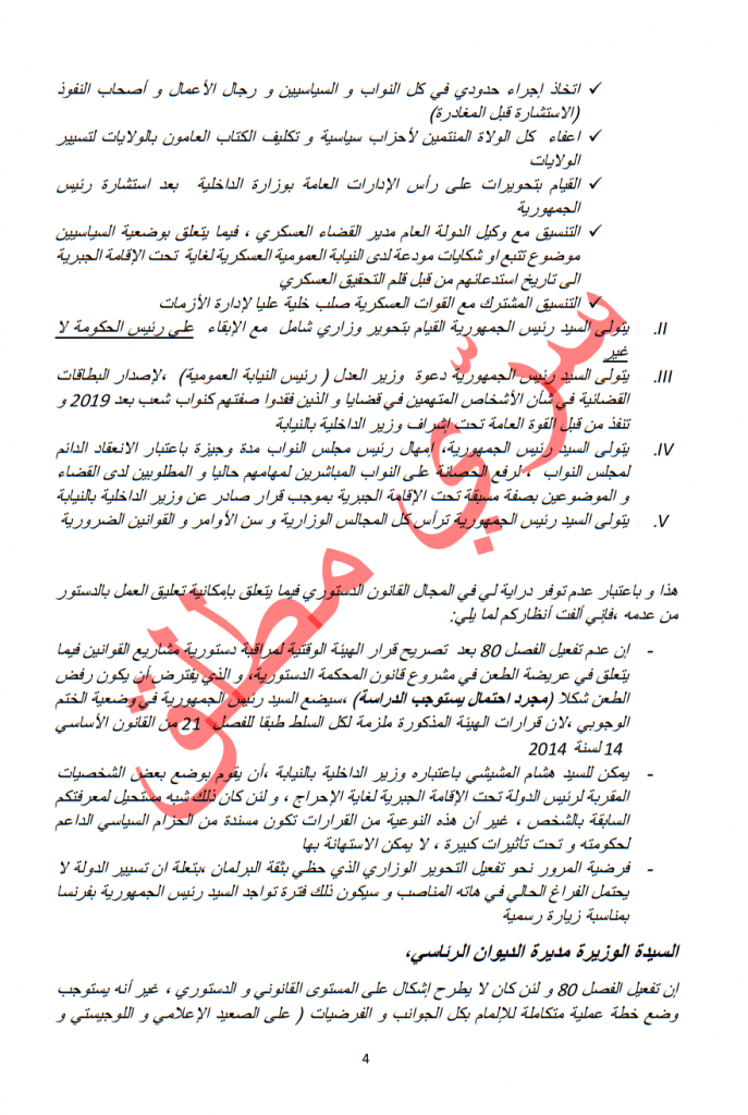 وتنص الوثيقة على أنه لن يُسمح للمشيشي والغنوشي بمغادرة القصر، الذي سيتم إدخاله في حالة عزلة كاملة عن الخارج، وفي تلك الأثناء سيوجه الرئيس خطابا تلفزيونيا إلى الأمة للإعلان عن انقلابه.