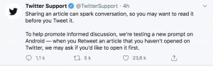 نشر موقع تويتر على موقعه أنه سيبدأ في اختبار ميزة جديدة من شأنها تشجيع المستخدمين على التفكير قبل نشر المقالات غير المقروءة.