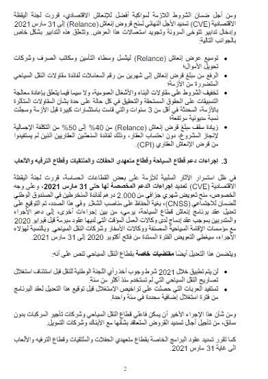 وحسب بلاغ وزارة الاقتصاد والمالية فقد تم تخصيص الاجتماع من أجل دراسة حصيلة الوضعية االقتصادية والمالية الوطنية، تمديد وتجويد عرض ضمان “Relance Damane”، إقرار تعديالت عقود البرامج المتعلقة بقطاع السياحة وقطاع متعهدي الحفالت والملتقيات، وكذا قطاع الترفيه واأللعاب بغية تمديد وتوسيع بعض إجراءات الدعم.