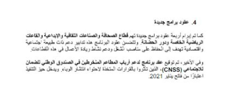 وأضاف البلاغ أنه تم التوقيع على خمسة عقود برامج جديدة تخص أرباب المطاعم، والصحافة، والصناعات الثقافية والإبداعية، والقاعات الرياضية الخاصة ودور الحضانة.