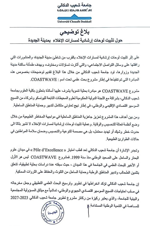 وجاء في البلاغ “على إثر تثبيت لوحات إرشادية لمسارات الإخلاء بالقرب من شاطئ مدينة الجديدة، والمنشورات التي رافقتها على وسائل التواصل الاجتماعي، ولتي أثارت تساؤلات ومخاوف، وبهدف طمأنة ساكنة مدينة الجديدة وزوارها، تود جامعة شعيب الدكالي من خلال هذا البلاغ تقديم توضيحات بخصوص هذه المبادرة التي تم تنفيذها في إطار مشروع بحث علمي تحت اسم: COASTWAVE”.