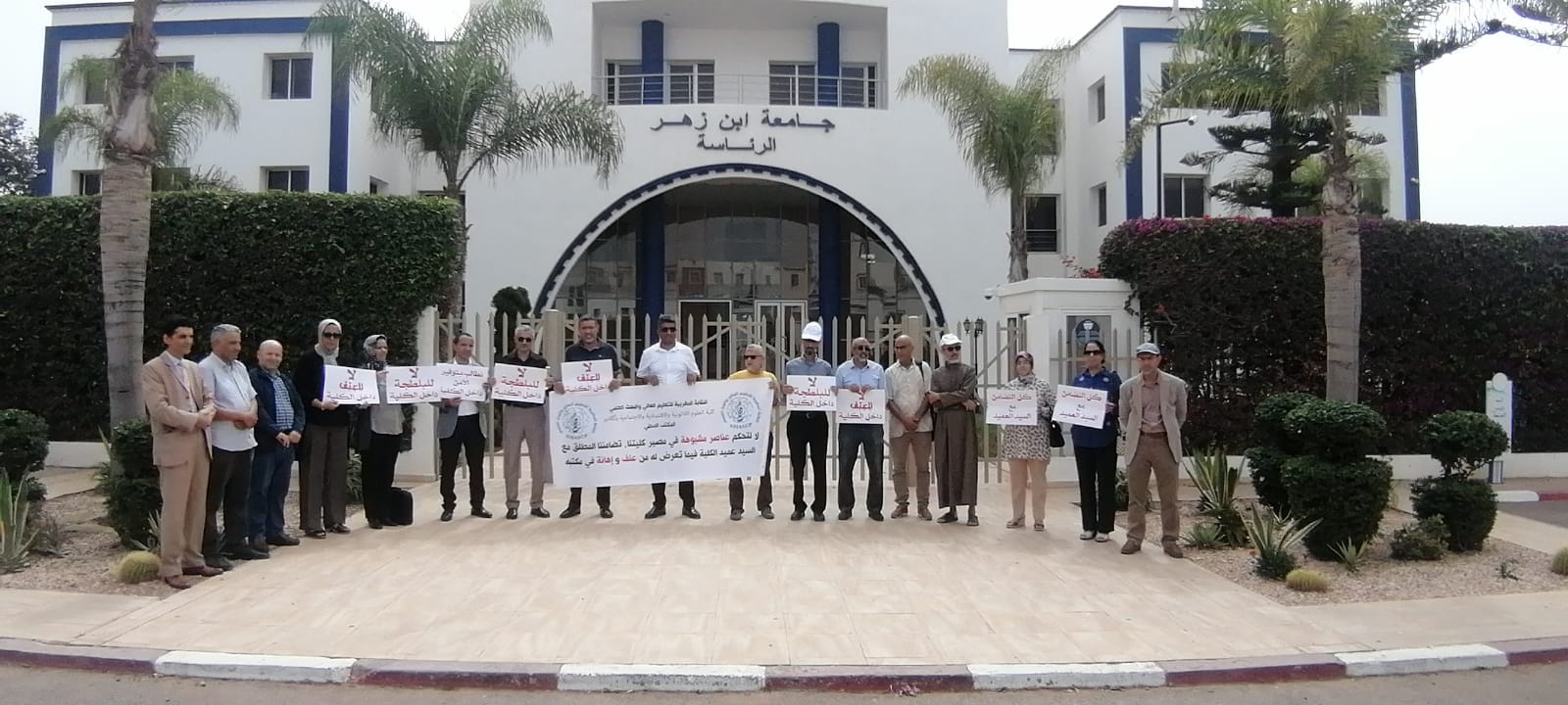 نظمت نقابات التعليم العالي بجامعة ابن زهر وقفة احتجاجية أمس الأربعاء، أمام رئاسة الجامعة، وحضرها أساتذة وموظفو كلية الحقوق بكثافة.