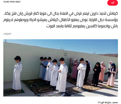 من جديد خرجت الجريدة المتطرفة “كود” بمادة إعلامية مثيرة للجدل، حيث استنكرت بشدة تعليم الأطفال الصلاة داخل المؤسسات التعليمية، وتساءلت “كيفاش تلامذ دايرين ليهم فرض في الصلاة بحال الى هوما كفار قريش إبان فتح مكة.. مؤسسة ديال القراية عوض يعلمو الأطفال كيفاش يعيشو الحياة ويوصلوهم لديبلوم باش يواجهوها كالسين يعلموهم ثقافة مابعد الموت”.