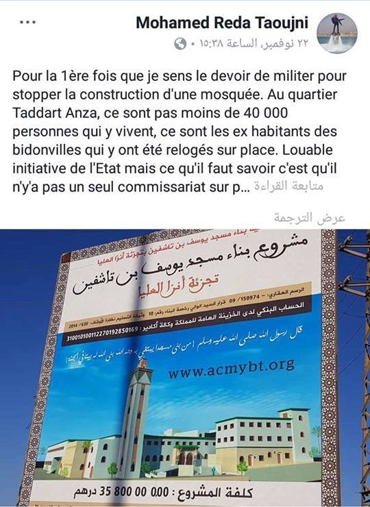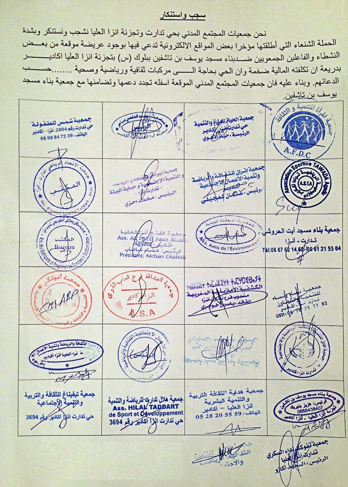 جمعيات المجتمع المدني بحي تدارت وأنزا العليا بأكادير تستنكر الحملة الشنعاء ضد بناء مسجد ومدرسة عتيقة بالمنطقة (وثائق)
