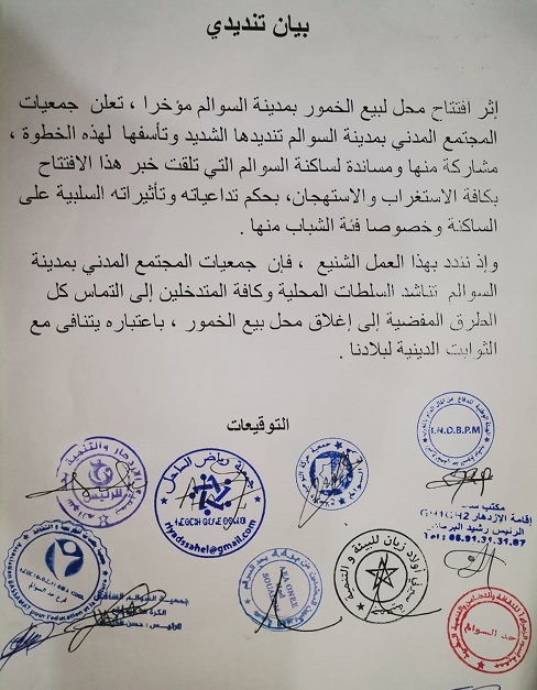 جمعيات المجتمع المدني بحد السوالم تتوحد لإغلاق محل لبيع الخمور (وثيقة)