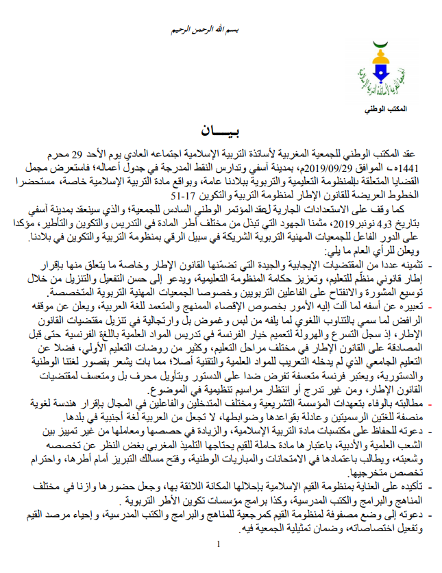 في ختام أشغال اجتماع مكتبها الوطني المنعقد اليوم الأحد 06 أكتبور 2019 بمدينة آسفي عبرت الجمعية المغربية لأساتذة التربية الإسلامية عن أسفها لما آلت إليه الأمور بخصوص الإقصاء الممنهج والمتعمد للغة العربية، وعن موقفها الرافض لما للتناوب اللغوي لما لفه من لبس وغموض وارتجال.