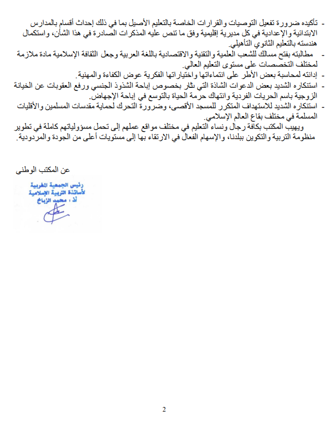 ودعت الجمعية إلى الحفاظ على مكتسبات مادة التربية الإسلامية واستكمال حاجياتها، مع ضرورة تغعيل التوصيات والقرارات الخاصة بالتعليم والتعليم الأصيل الجديد بمختلف اأسلاكه. وفيما يلي نص البيان كاملا: