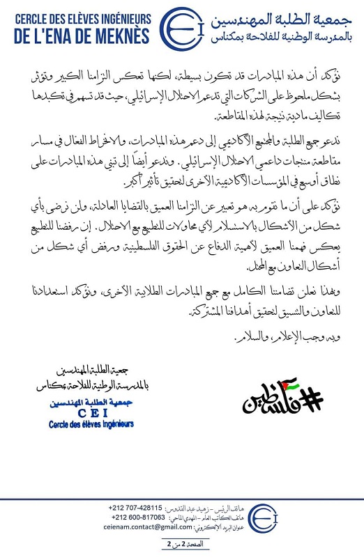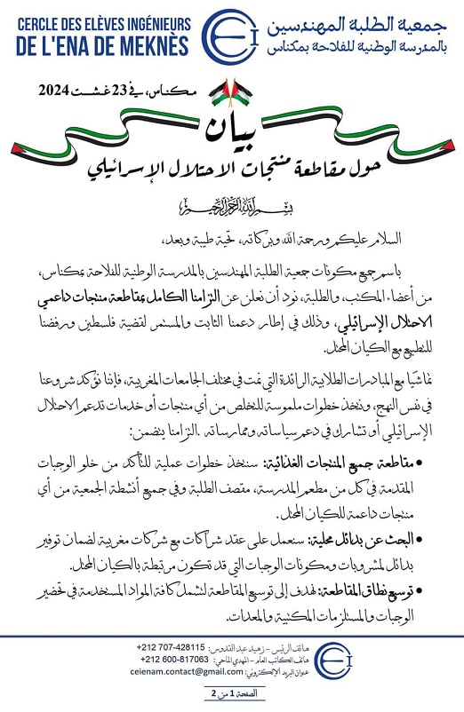 أعلنت جمعية الطلبة المهندسين بالمدرسة الوطنية للفلاحة بمكناس عن قرارها بمقاطعة منتجات داعمي الاحتلال الإسرائيلي، وذلك كجزء من دعمها الثابت والمستمر لقضية فلسطين ورفضها للتطبيع مع الكيان المحتل.