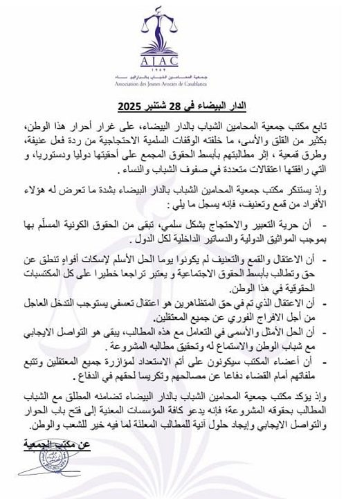 أعربت جمعية المحامين الشباب بالدار البيضاء عن استنكارها الشديد لأساليب التعنيف والقمع التي طالت المشاركين في الوقفات الاحتجاجية.