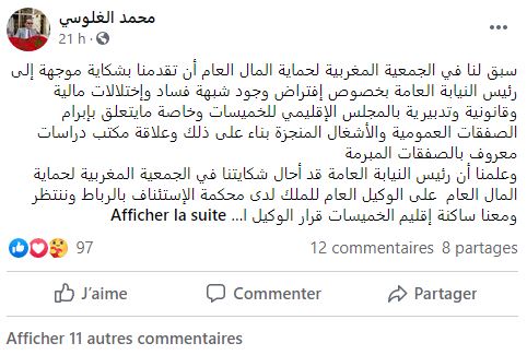 وأضاف الغلوسي في تدوينة له، أن إقليم الخميسات يفتقر للبنيات التحتية والخدمات العمومية، حيث يواجه أهله التهميش والإقصاء نتيجة تغول بعض مدبري الشأن العمومي وانصرافهم لمراكمة الثروة عن طريق توظيف المركز الوظيفي والقرار العمومي للاغتناء غير المشروع.
