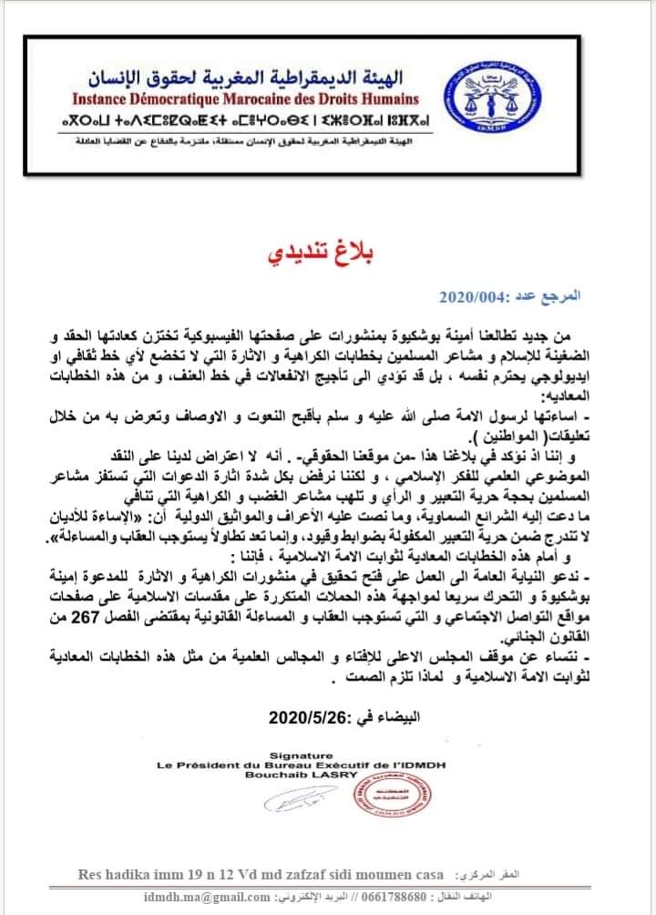 وأمام هذه الخطابات المعادية لثوابت الأمة الاسلامية، دعت الهيئة الديمقراطية المغربية لحقوق الإنسان النيابة العامة إلى العمل على فتح تحقيق في منشورات الكراهية والإثارة للمدعوة أمينة بوشكيوة والتحرك سريعا لمواجهة هذه الحملات المتكررة على مقدسات الاسلامية على صفحات مواقع التواصل الاجتماعي والتي تستوجب العقاب والمساءلة القانونية بمقتضى الفصل 209 من القانون الجنائي.