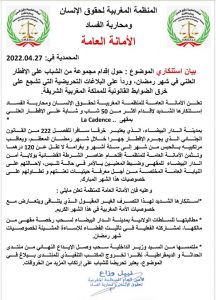 هذا واستنكرت المنظمة المغربية لحقوق الإنسان ومحاربة الفساد، إقدام أكثر من 50 شابا وشابة على الإفطار العلني بأحد المقاهي بمدينة الدار البيضاء، واصفة الأمر بـ”التصرف غير المقبول الذي يتنافى ويتعارض مع خصوصيات الأمة المغربية في هذا الشهر الكريم”.
