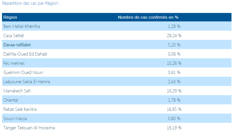 وتحتل جهة العيون الساقية الحمراء المرتبة السابعة ب 274+43حالات.